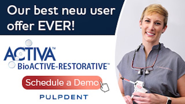 | | | | | | | Sponsored | | | | Pulpdent is celebrating 10+ years of clinical success for ACTIVA™, the first bioactive, esthetic, load-bearing restorative material, with its best New User Offer ever. This limited-time intro offer is available only through local Pulpdent Area Representatives. Click through and discover why ACTIVA™ BioACTIVE-RESTORATIVE™ is the everyday win-win material for you and your patients alike. |